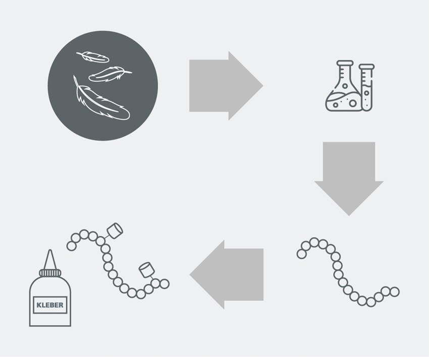 Tot nu toe werden lijmen bijna altijd geproduceerd uit fossiele grondstoffen zoals ruwe olie. Het Fraunhofer Institute for Interfacial Engineering and Biotechnology IGB pakt het nu anders aan. De onderzoekers gebruiken veren als uitgangsmateriaal in plaats van ruwe olie. Veren hopen zich op als afval tijdens de productie van pluimveevlees. Ze worden vernietigd of gemengd in diervoeder. Veren zijn echter veel te goed voor afval, omdat veren het structurele eiwit keratine bevatten. Dit biopolymeer wordt door dieren gevormd voor klauwen, hoeven en veren. De vezelstructuur zorgt voor een hoge sterkte.