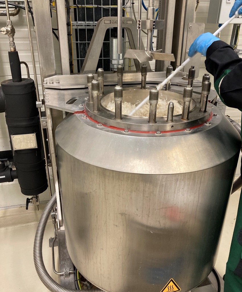 Bij het Fraunhofer CBP werd het proces opgeschaald en werden enkele kilo’s kippenveren verwerkt (foto: Fraunhofer CBP)