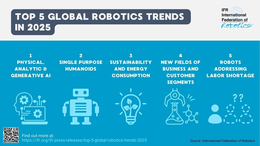 De wereldwijde marktwaarde van industriële robotinstallaties heeft een recordhoogte van 16,5 miljard Amerikaanse dollars bereikt. De toekomstige vraag zal worden aangedreven door een aantal technologische innovaties, marktkrachten en nieuwe bedrijfstakken. De International Federation of Robotics rapporteert over de top 5 trends voor de robotica-industrie voor 2025.
