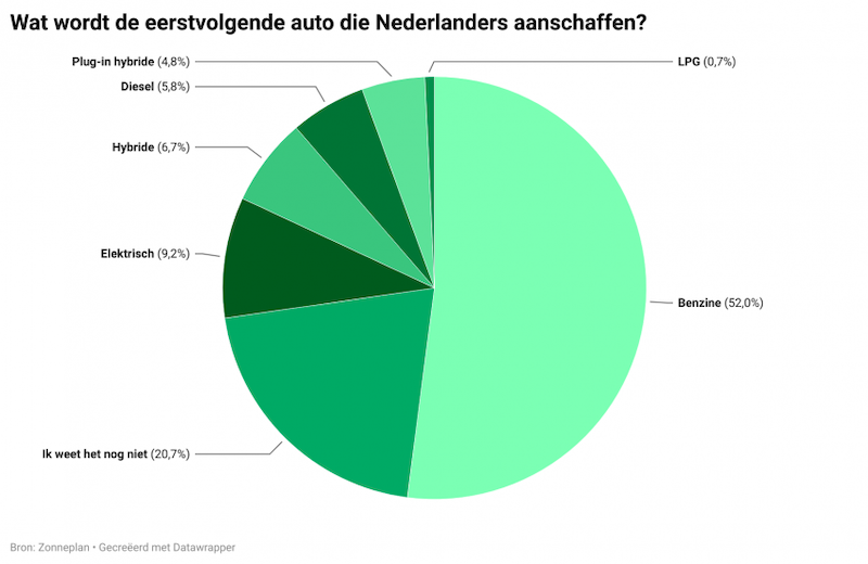 Dit blijkt uit onderzoek dat is uitgevoerd door het onafhankelijke veldwerkbureau Panel Inzicht in opdracht van leveranciers van onder meer zonnepanelen onder 2.000 Nederlanders. 52% van de respondenten meldt bij de aanschaf van een volgende auto te kiezen voor een benzineauto. Een volledig elektrische auto staat met grote afstand op de tweede plek; 9,2% van de ondervraagde Nederlanders zegt een elektrische wagen als volgende auto te willen aanschaffen.