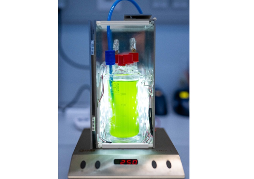 Openingsfoto: Fotobioreactor van Fraunhofer FEP op laboratoriumschaal voor het kweken van cyanobacteriën onder gedefinieerde licht-, temperatuur- en gasomstandigheden Foto: Fraunhofer FEP