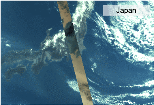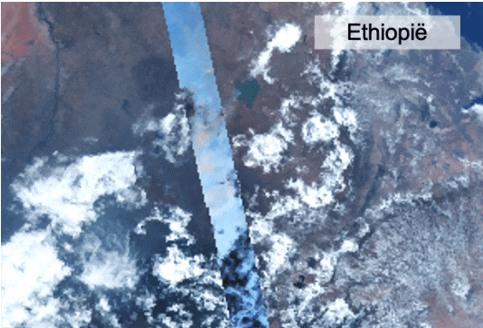 Figuur 2: SPEXone werpt haar 100-km brede blikveld over Japan (boven) en Ethiopië (onder). Het instrument meet voor verschillende kleuren in welke mate het zonlicht wordt gepolariseerd, vanuit vijf verschillende kijkhoeken. Credit: SRON