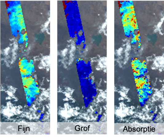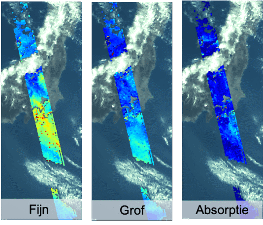 Figuur 3 toont de eigenschappen van aerosolen boven Japan (figuur 3a) en Ethiopië (figuur 3b). Beide bestaan voornamelijk uit fijne deeltjes. Beide linkerpanelen tonen immers veel rode en gele plekken, terwijl de middenpanelen grotendeels blauw zijn. In het rechterpanel zien we dat het fijnstof boven Ethiopië veel zonlicht absorbeert; het heeft de signatuur van rook door de verbranding van biomassa. Boven Japan zien we veel fijnstof rond Tokio, richting het zuiden geblazen door de wind. Daar toont het rechterpanel de signatuur van een mix van aerosol uit industrie en transport en natuurlijk fijnstof zoals zeezout.