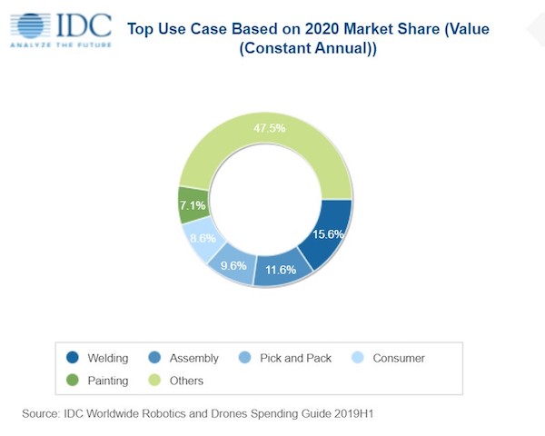 De maakindustrie is dit jaar de grootste afnemer van roboticasystemen, voorspelt IDC. Naar verwachting schaffen maakbedrijven voor 53,8 miljard dollar aan robots aan in 2020. De procesindustrie, grondstoffenindustrie, zorg en retailsector volgen. Het gebruik van robots groeit het snelst onder groothandels (30,5% CAGR), retailers (29,3% CAGR) en bouwbedrijven (25,2% CAGR).