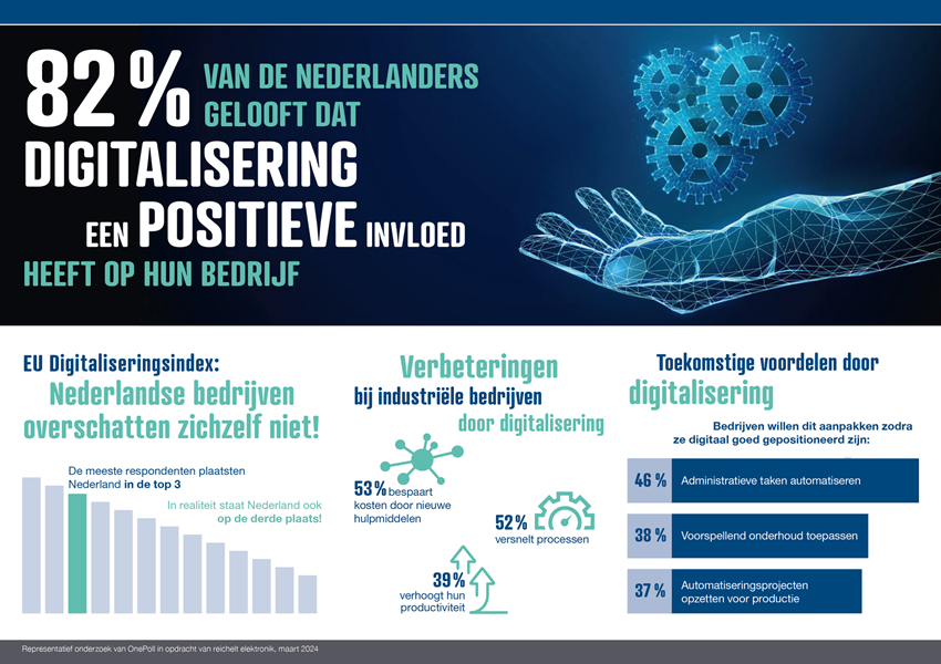 De meeste Nederlandse industriële bedrijven profiteren nu al sterk van digitaliseringsprojecten. Wat zien bedrijven als een positieve vooruitgang en tegen welke problemen lopen ze nog aan als het gaat om digitalisering? Een onafhankelijk onderzoek onder 250 Nederlandse industriële bedrijven in opdracht van reichelt elektronik brengt deze vragen onder de aandacht.
