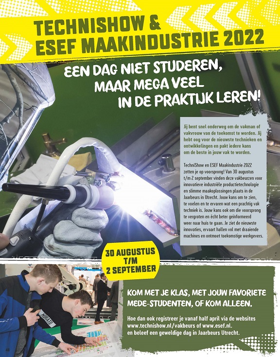 TechniShow en ESEF Maakindustrie 2022 zetten je op voorsprong! Van 30 augustus tot en met 2 september vinden deze vakbeurzen voor innovatieve industriële productietechnologie en slimme maakoplossingen plaats in de Jaarbeurs in Utrecht. Jouw kans om te zien, te voelen en te ervaren wat een prachtig vak techniek is. Jouw kans ook om die voorsprong te vergroten en écht beter geïnformeerd weer naar huis te gaan. Je ziet de nieuwste innovaties, ervaart hallen vol met draaiende machines en ontmoet toekomstige werkgevers.