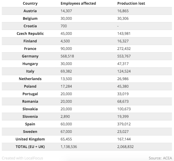 Veel autofabrieken in de Europese Unie (EU) zijn gesloten om de verspreiding van het coronavirus in te perken. De sluitingen leiden tot een forse productieverlies in de sector; tot nu toe zijn ruim twee miljoen auto’s minder geproduceerd.
