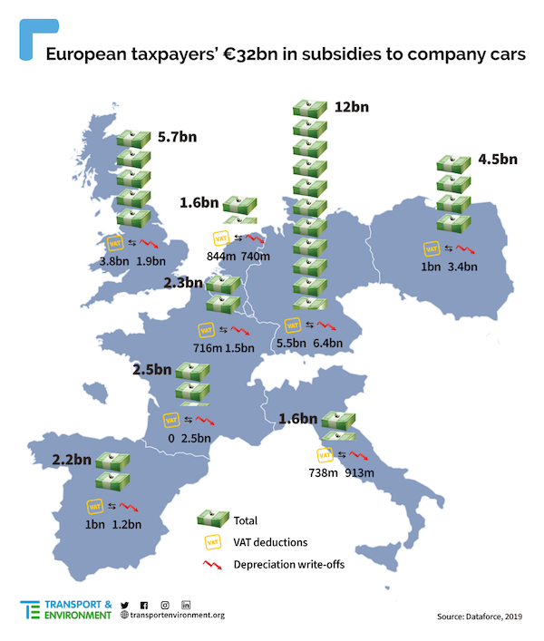 Eerder deze maand bleek al uit cijfers van T&E dat subsidies voor bedrijfsauto’s Europese belastingbetalers jaarlijks 32 miljard euro kosten, terwijl deze subsidie bijna geheel wordt besteed aan benzine- en dieselvoertuigen. Voor de Nederlandse belastingbetaler liggen deze kosten op ongeveer 1,6 miljard euro per jaar.