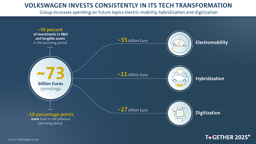 De Duitse autofabrikant maakte vorige maand bekend zijn investeringen in toekomstige mobiliteit te verhogen. De Volkswagen Groep investeert in de komende vijf jaar ongeveer 73 miljard euro in elektrificatie, hybride aandrijflijnen en digitale technologie. De investeringen in ontwikkelingskosten en R&D voor toekomstige technologieën worden verhoogd van 40 naar 50 procent van de totale investeringen van de Groep, die circa 150 miljard euro bedragen.