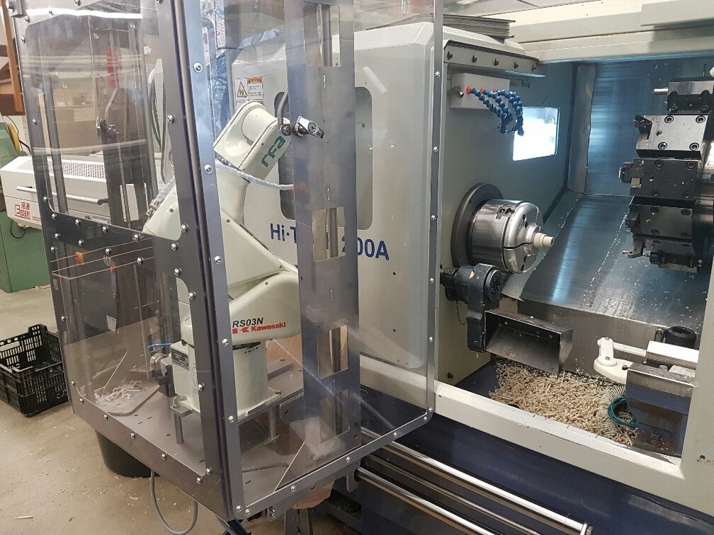 Het gaat om een 6-assige Kawasaki RS003N robot, die is geplaatst bij een Hwacheon Hi-Tech 200A draaibank voor het produceren van kunststof precisieonderdelen. De robot biedt een werkbereik van 1.240 mm en een hanteringscapaciteit van 3 kg. De RS003N wordt ingezet om geautomatiseerd kunststof werkstukken in de klauwplaat te zetten en deze na het draaien weer te verwijderen.