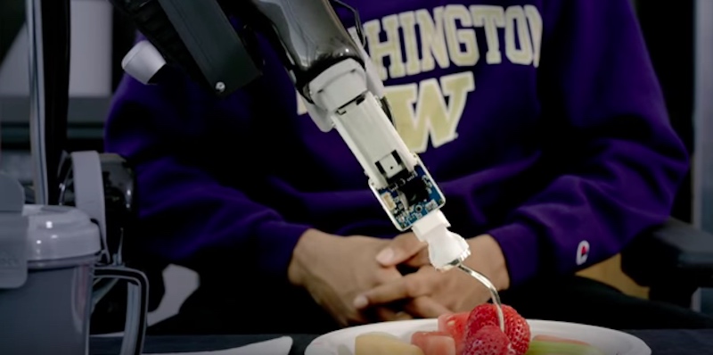 Onderzoekers van de University of Washington hebben een robotarm getraind om gebruikers te helpen bij eten en drinken. De robot is onder meer in staat zelfstandig te bepalen welke soorten eten op een bord ligt en kan autonoom bepalen hoe dit voedsel het best kan worden opgepakt en in de mond van de gebruiker kan worden gestopt. De robotarm kan op een rolstoel worden bevestigd zodat deze altijd bij beschikbaar is.